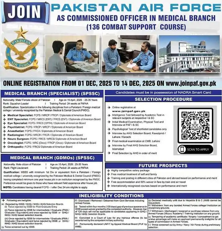 Joining PAF as Medical Officer is directly related to the job in medical field at commissioned level. Candidate must have a degree of MBBS related to the specialization of Urology, Orthopedic, Gastroenterology, Dental Surgeon, Pulmonology, and Neurology.