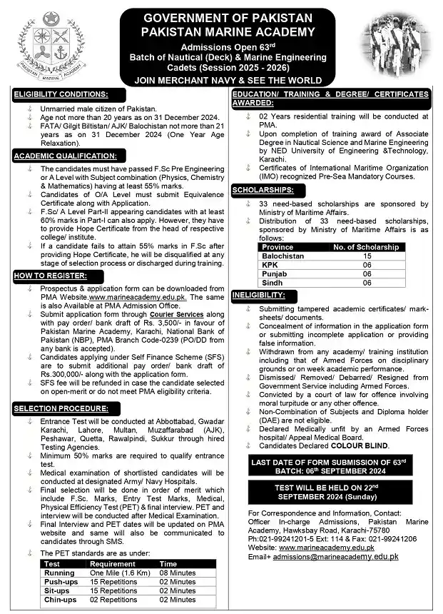 Address: Officer In-Charge Admissions, Pakistan Marine Academy, Hoxbey Road, Karachi (75780),